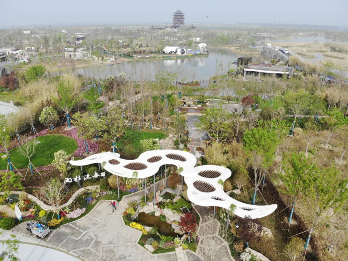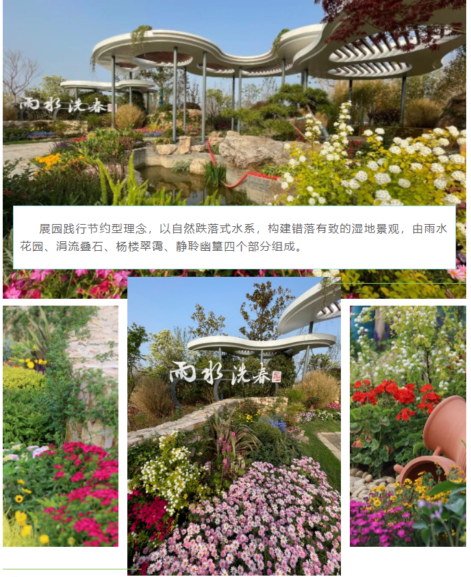 第十二届江苏省园艺博览会盐城展园——“雨水洗春”,占地面积8300平方米,绿化面积72%,道路广场13%,水面积15%。展园定位为城市公园和郊野自然风光相结合的雨水园艺精品展园,以雨水收集、过滤、利用为主线,用铺装透水明沟导水、梯田滞水、湿地净水蓄水等手法,集中展示“渗、滞、蓄、净、用、排”等雨水净化原理。