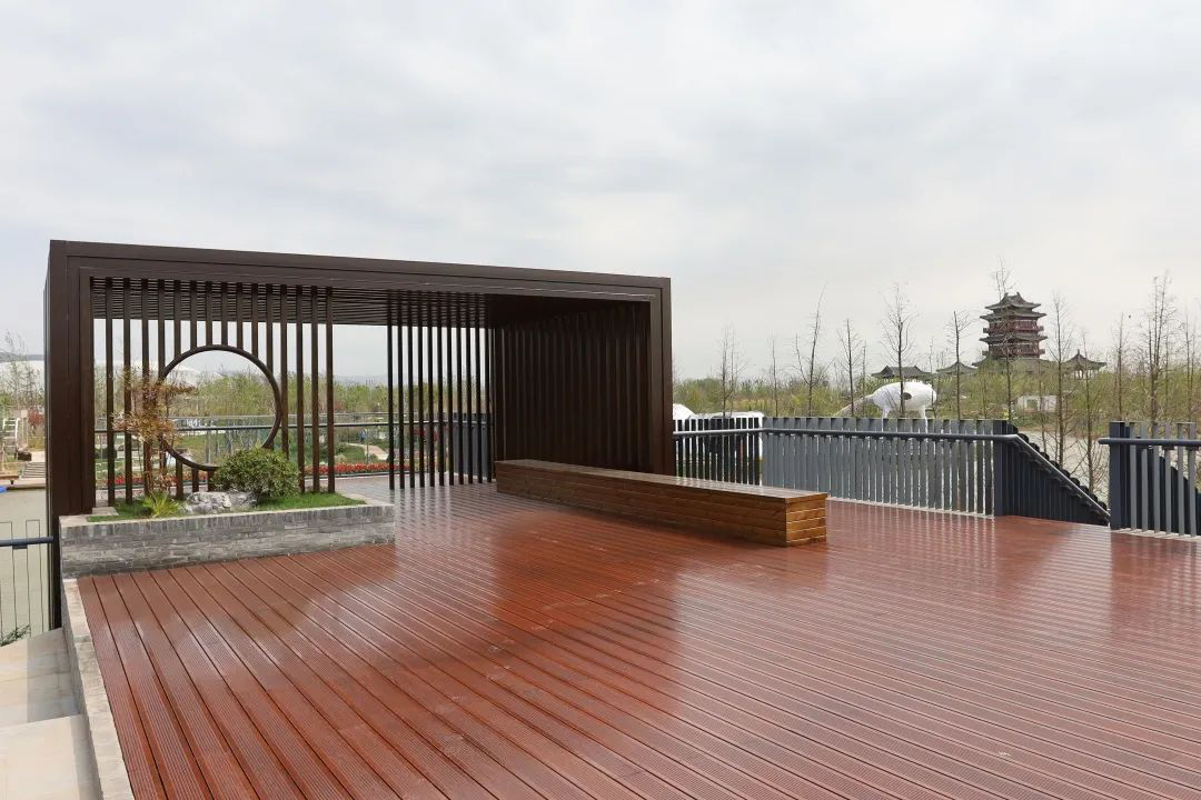 通过叠石流水营造和展示园林意境,借景秦东阁,让盐城展园自然融入园博园。展园坚持绿色、低碳、环保理念,将雨水经过湿地净化后提取再利用,作为展园绿化的灌溉水源。