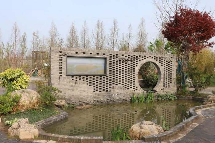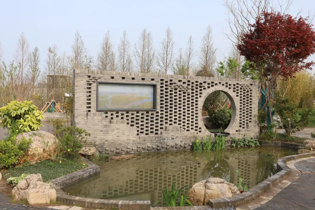 展园游路铺设有“盐城园”logo砖雕,使用透水材料引导雨水自然渗透,并建有无障碍通道。盐城风格的假山出自盐文化“淋卤煎盐”,展示馆更是融合了盐城民居特色与现代园林风格,传承了盐城园林文化。一楼室内为雨水收集、净化、提升、灌溉展示,实物演绎雨水净化过滤过程。栈道平台后临水区域栽植了芦苇、草蒲等可净化水质的水生植物,展现滩涂湿地风貌。