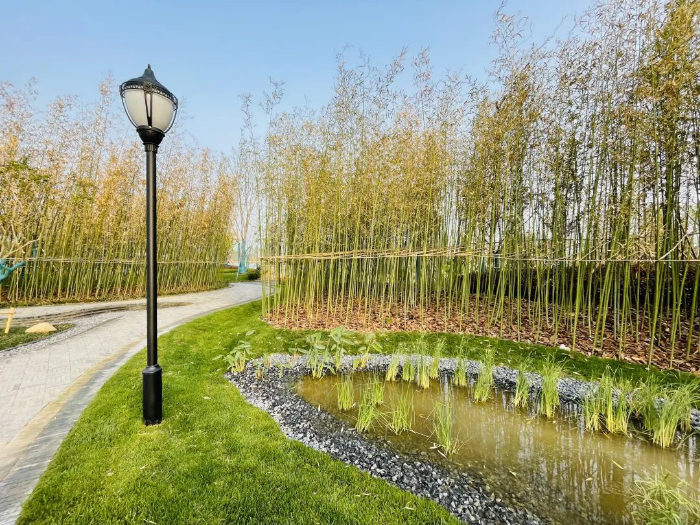 以写实手法描绘了烟雨港城水绿相融的美丽风光。按照植物生物多样性要求,大量使用本土化、彩叶化的适生植物和耐盐碱植物,造园元素绿色、低碳、环保。园内雨水流向溪流、渗透大地,最后汇入水池,构成较为完整的湿地微生态系统。
