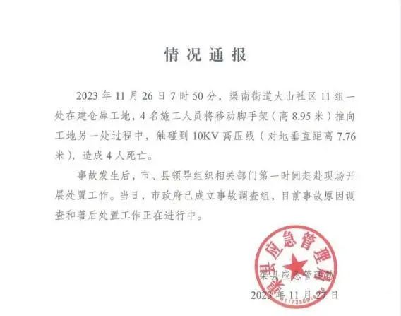 2023年11月26日,四川省达州市渠县发生一起触电事故,4名施工人员将移动脚手架(高8.95米)推向工地另一处过程中,触碰到10KV高压线(对地垂直距离7.76米),造成4人死亡。