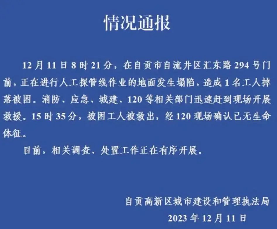 2023年12月11日,在四川省自贡市自流井区汇东路294号门前,正在进行人工探管线作业的地面发生塌陷,造成1名工人死亡。