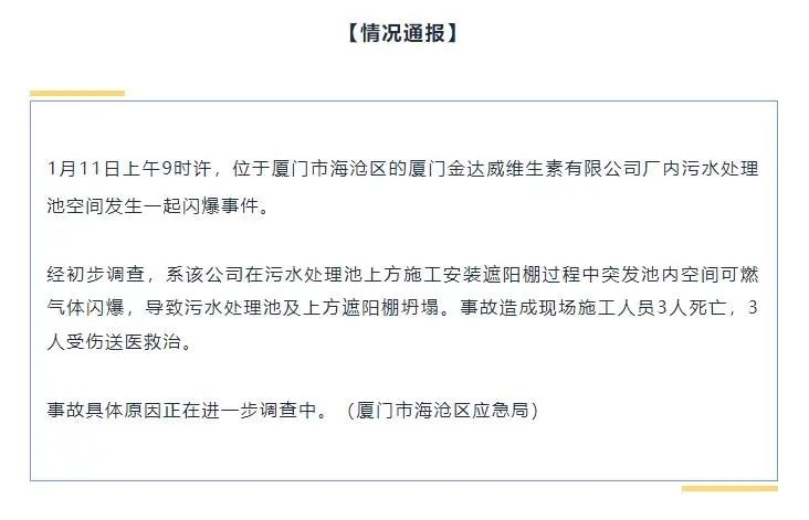 2024年1月11日9时许,福建省厦门市海沧区一公司在污水处理池上方施工安装遮阳棚过程中,突发池内空间可燃气体闪爆,导致污水处理池及上方遮阳棚坍塌,事故造成现场施工人员3人死亡、3人受伤。