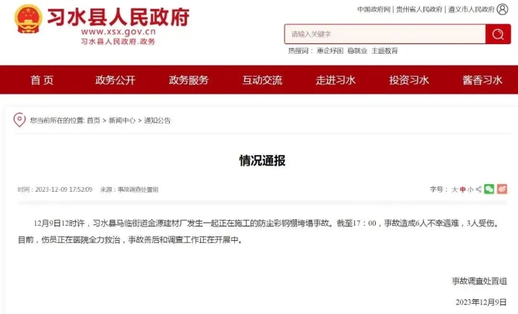 12月9日,贵州省遵义市习水县一建材厂正在施工的防尘彩钢棚发生垮塌事故,已造成6人不幸遇难、3人受伤。