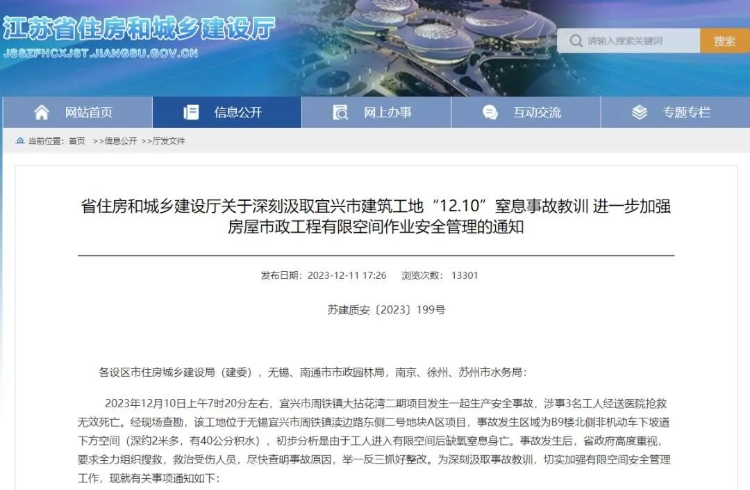2023年12月10日,江苏省无锡市宜兴市周铁镇渎边路东侧二号地块A区项目发生一起中毒窒息事故,造成3人死亡。为严格落实安全生产责任,严肃事故处理,发挥事故警示教育作用,防范类似事故发生,住房和城乡建设部对该事故查处督办。