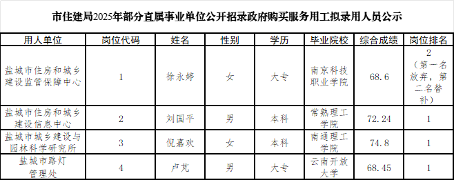 根据《盐城市住房和城乡建设局关于部分直属事业单位2025年公开招录政府购买服务用工人员的公告》要求,经过报名、资格审查、笔试、面试、体检、考察等程序,拟确定以下人员为录用对象,现进行公示: