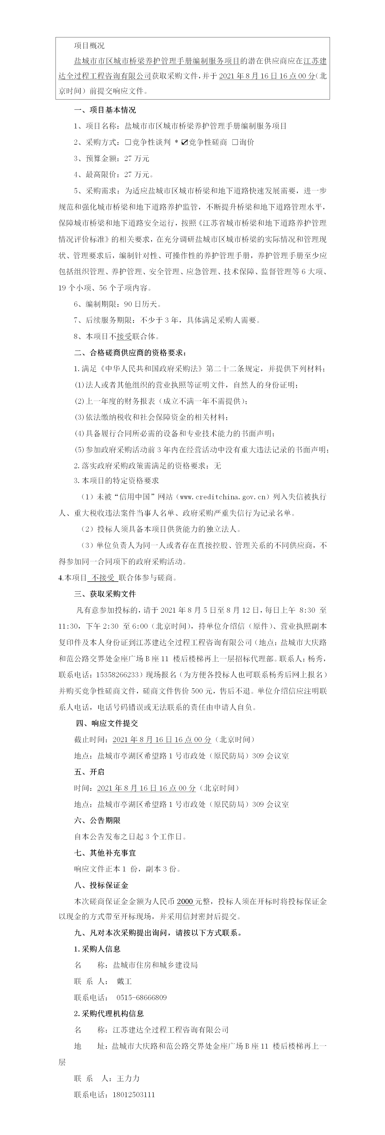 盐城市市区城市桥梁养护管理手册编制服务项目竞争性磋商采购公告