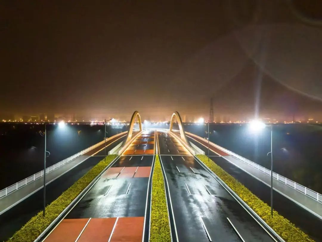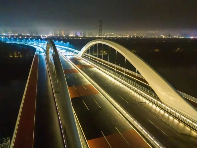 赣江路—海洋路连接大桥位于盐城中心城区南部,贯穿盐城经济技术开发区和盐南高新区,西起海洋路与开放大道交叉口,沿规划线位向东,下穿盐通高铁、新长铁路后上跨东伏河、通榆河,最终止于天山南路,全长2.2千米,宽度50米,采用双向6车道城市主干路设计,是三跨连续钢箱梁拱组合桥,整体造型新颖,简洁大方。
