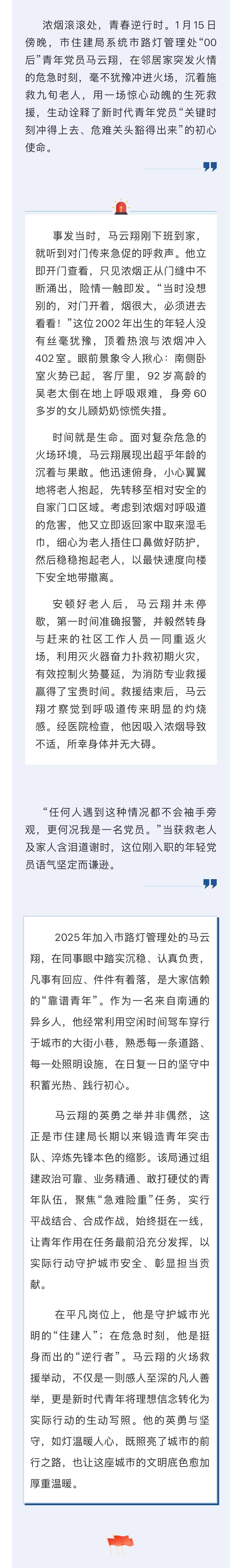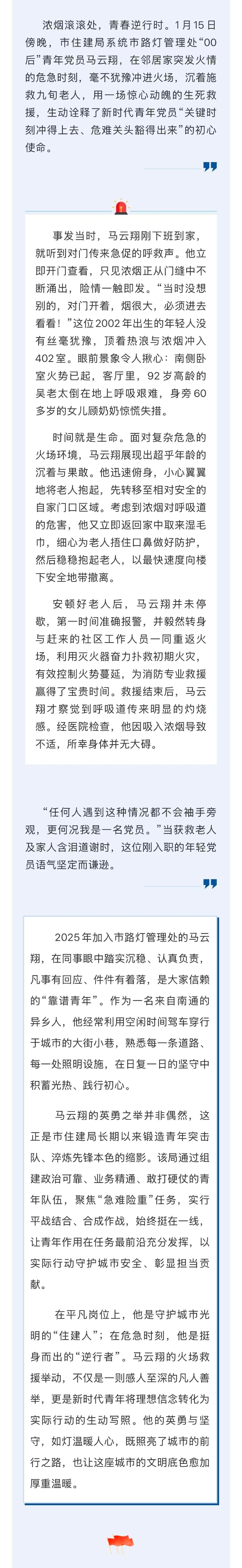 住建青年危急时刻显担当 “00后”党员火场逆行勇救九旬老人